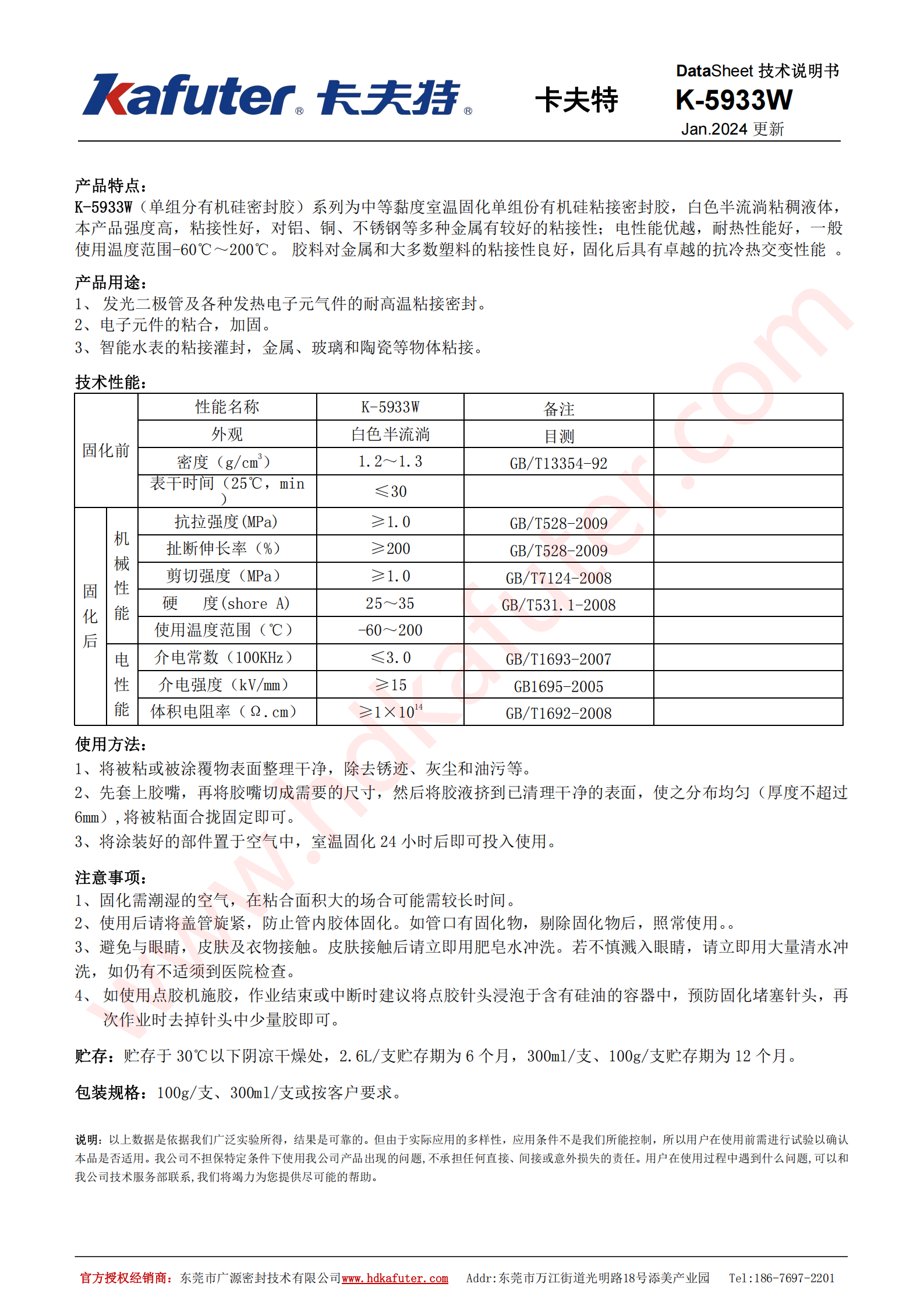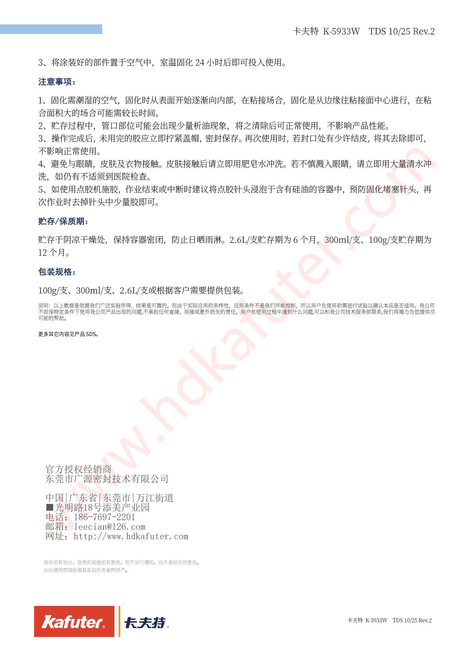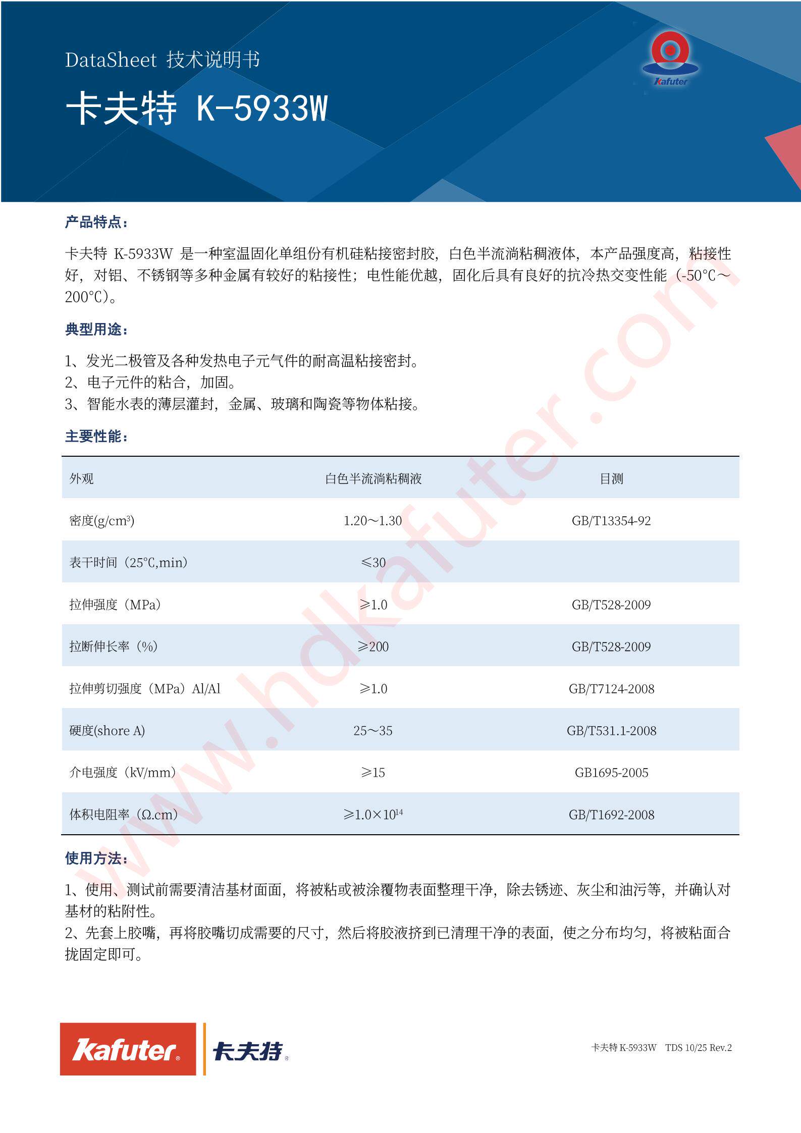 K-5933W单组分有机硅密封胶系列为中等黏度室温固化单组份有机硅粘接密封胶,白色半流淌粘稠液体,本产品强度高,粘接性好,对铝、铜、不锈钢等多种金属有较好的粘接性;电性能优越,耐热性能好,一般使用温度范围-60℃~200℃。