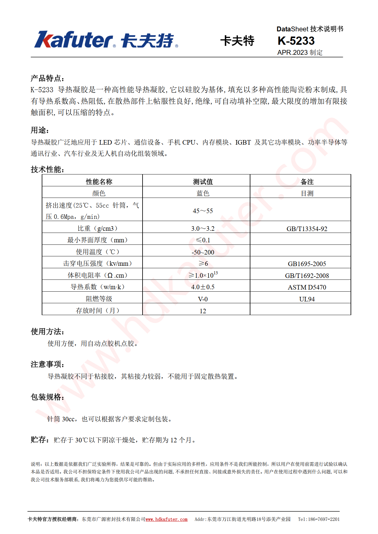 卡夫特K-5233导热凝胶广泛地应用于 LED 芯片、通信设备、手机 CPU、内存模块、 IGBT 及其它功率模块、功率半导体等通讯行业、汽车行业及无人机自动化组装领域。卡夫特官方授权经销商-东莞市广源密封技术有限公司www.hdkafuter.com,销售技术支持热线:18676972201,李经理