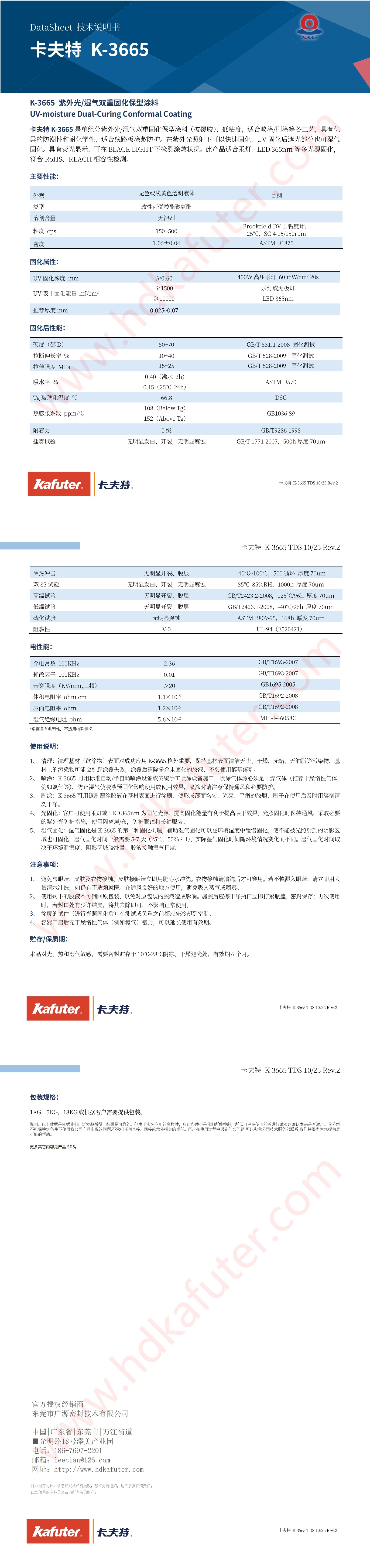 卡夫特 K-3665 是单组分紫外光/湿气双重固化保型涂料(披覆胶),低粘度,适合喷涂/刷涂等各工艺,具有优 异的防潮性和耐化学性,适合线路板涂敷防护。在紫外光照射下可以快速固化,UV 固化后遮光部分也可湿气固化。具有荧光显示,可在BLACK LIGHT下检测涂敷状况。此产品适合汞灯、LED 365nm等多光源固化,符合 RoHS、REACH 相容性检测。