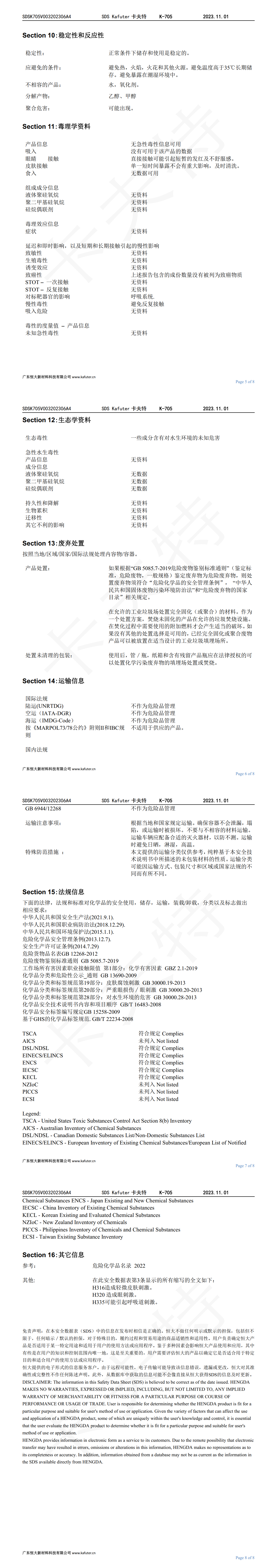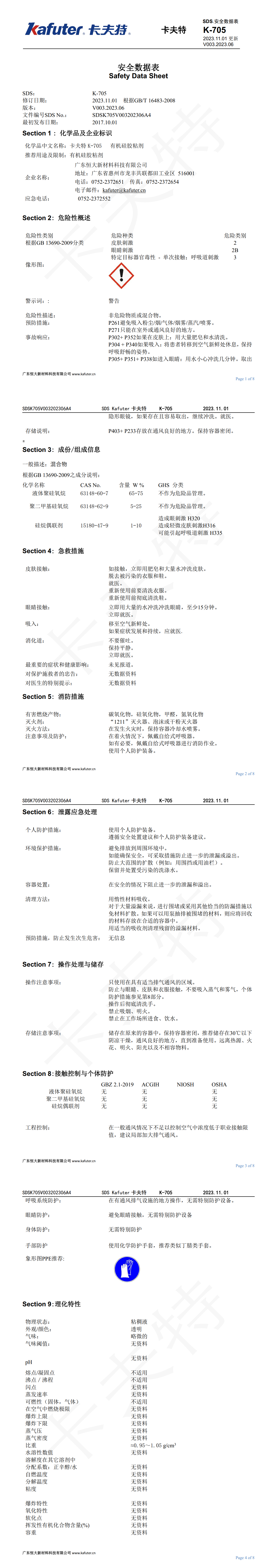 卡夫特K-705透明硅胶 MSDS报告/SDS安全技术说明书