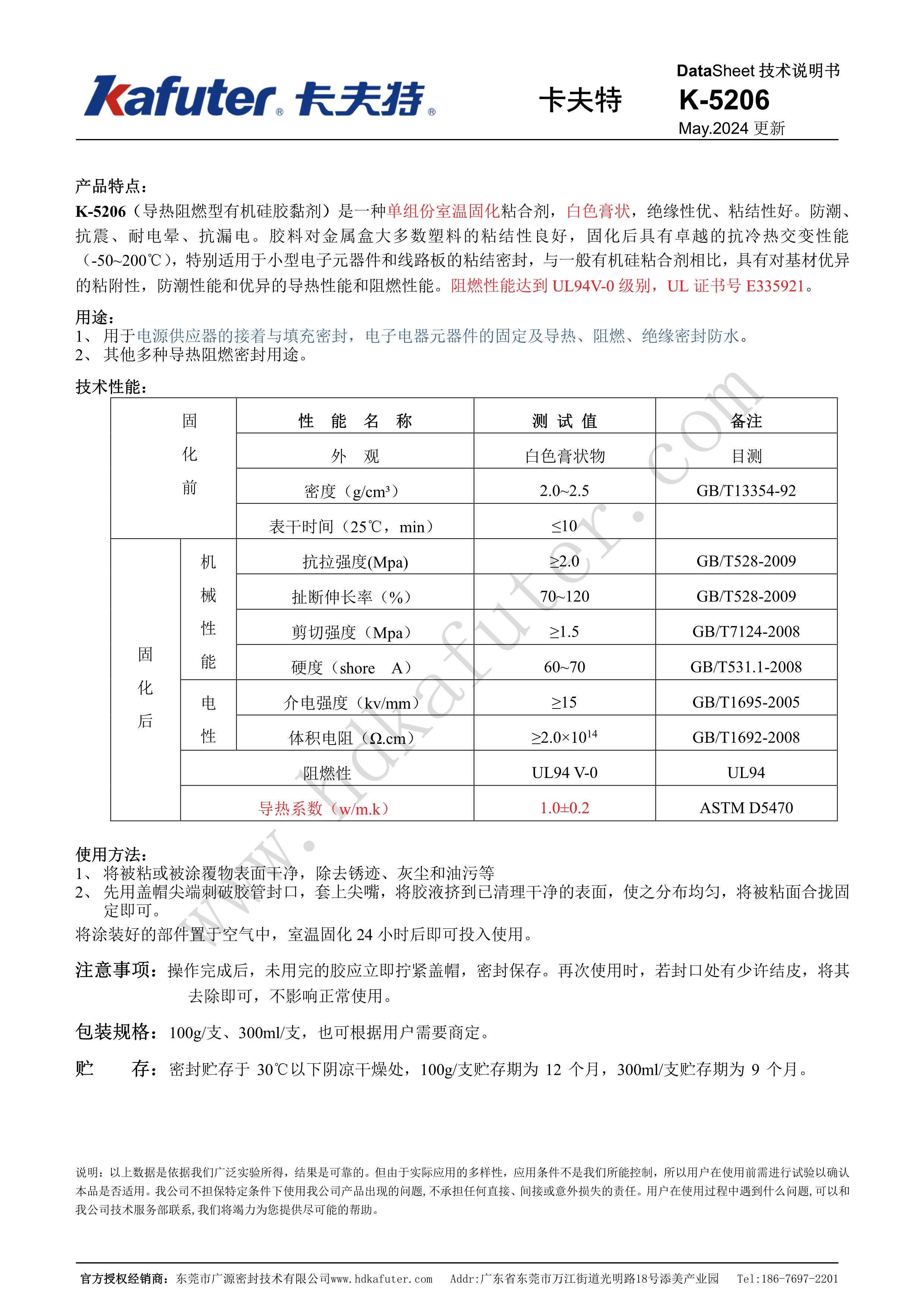 卡夫特K-5206导热阻燃型有机硅胶黏剂是一种单组份室温固化粘合剂,白色膏状,绝缘性优、粘结性好。防潮、抗震、耐电晕、抗漏电。胶料对金属盒大多数塑料的粘结性良好,固化后具有卓越的抗冷热交变性能(-50~200℃),特别适用于小型电子元器件和线路板的粘结密封,与一般有机硅粘合剂相比,具有对基材优异的粘附性,防潮性能和优异的导热性能和阻燃性能。阻燃性能达到UL94V-0级别, UL证书号 E335921。