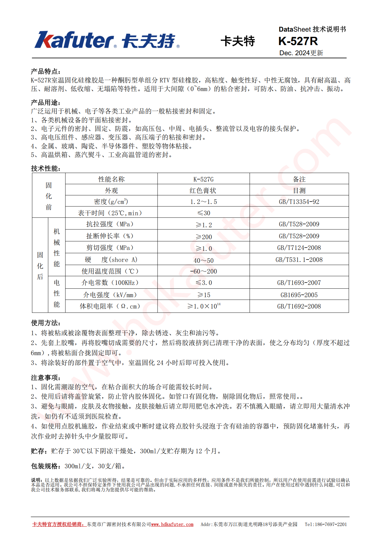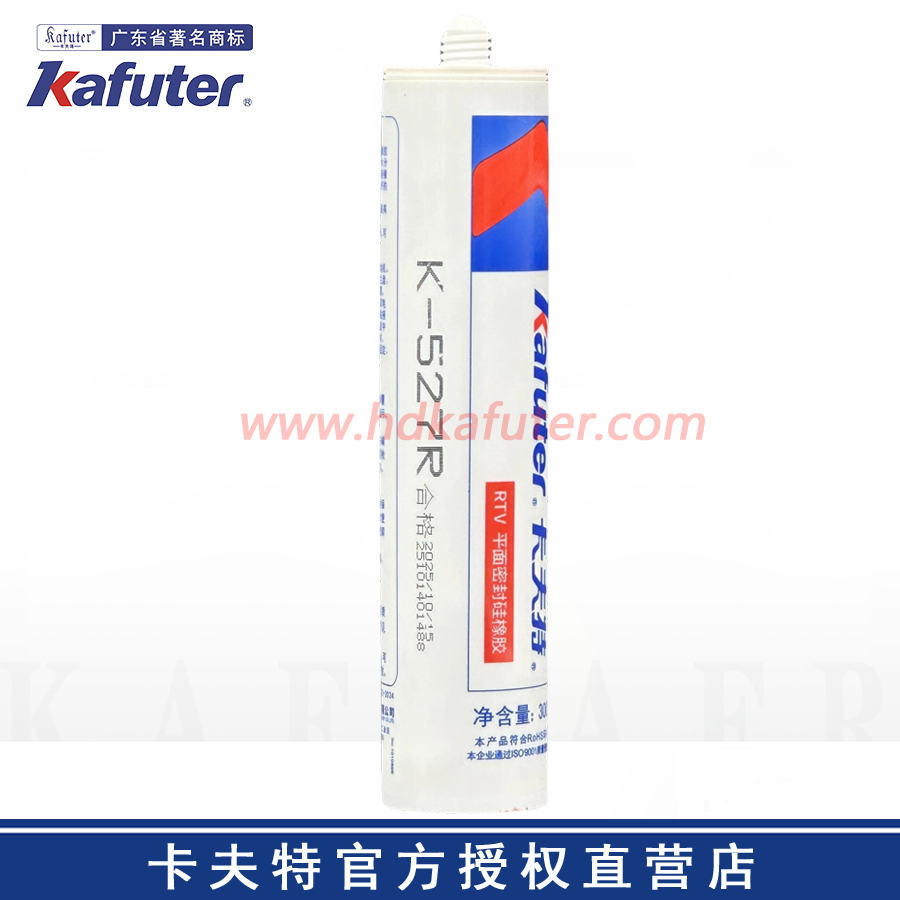 卡夫特K-527R酮肟型单组分 RTV型硅橡胶,高粘度、触变性好、中性无腐蚀,具有耐高温、高压、耐溶剂、低收缩、无塌陷等特性。适用于大间隙(0~6mm)的粘合密封,可防水、防油、抗冲击、振动。卡夫特官方授权经销商-东莞市广源密封技术有限公司www.hdkafuter.com,销售技术支持热线:18676972201