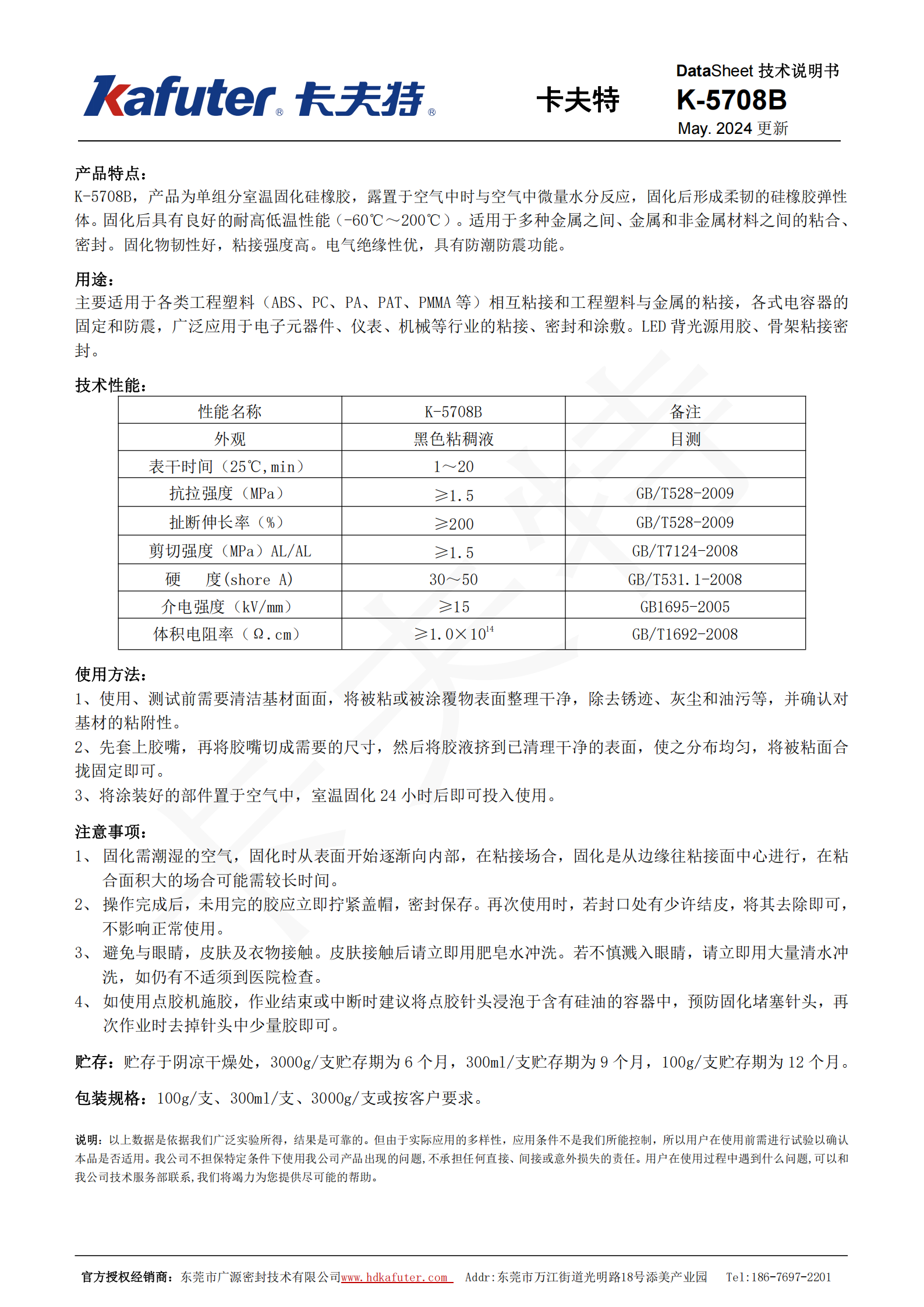 卡夫特K-5708B有机硅密封胶为单组分室温固化硅橡胶,露置于空气中时与空气中微量水分反应,固化后形成柔韧的硅橡胶弹性体。固化后具有良好的耐高低温性能(-60℃~200℃)。适用于多种金属之间、金属和非金属材料之间的粘合、密封。固化物韧性好,粘接强度高。电气绝缘性优,具有防潮防震功能。