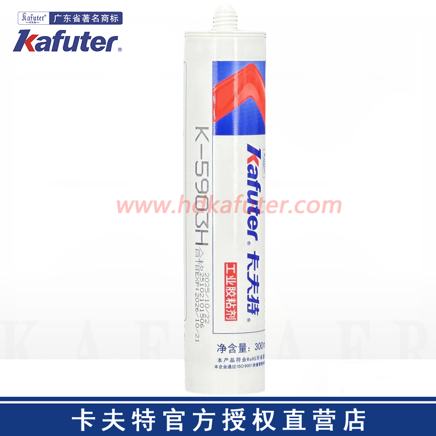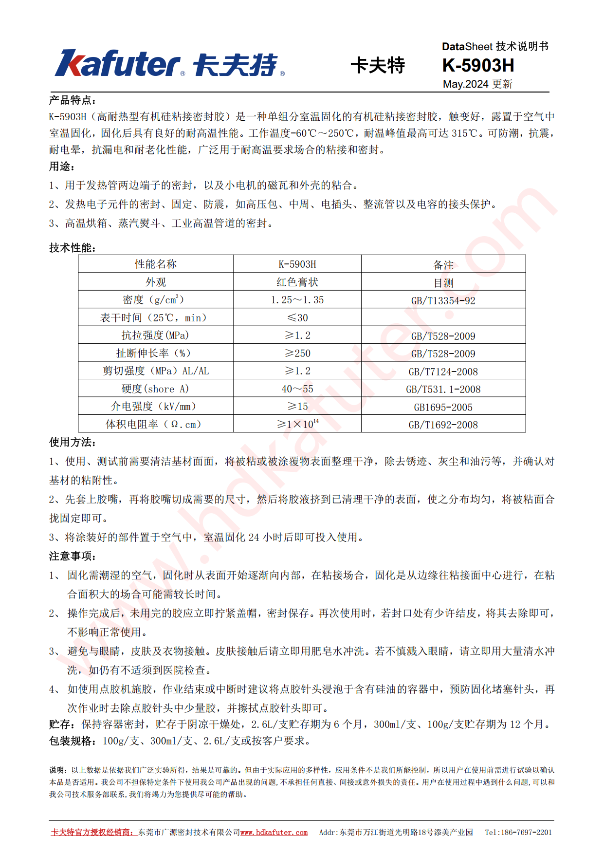 卡夫特K-5903H耐高温密封胶是一种单组分室温固化的有机硅粘界密封胶, 具有更优的耐高温性能。可在-60~315℃范围内使用, 可防潮, 抗震, 耐电晕, 抗漏电和耐老化性能, 广泛用于耐高温要求苛刻场合的粘接和密封。卡夫特官方授权经销商-东莞市广源密封技术有限公司www.hdkafuter.com,销售技术支持热线:18676972201,李经理