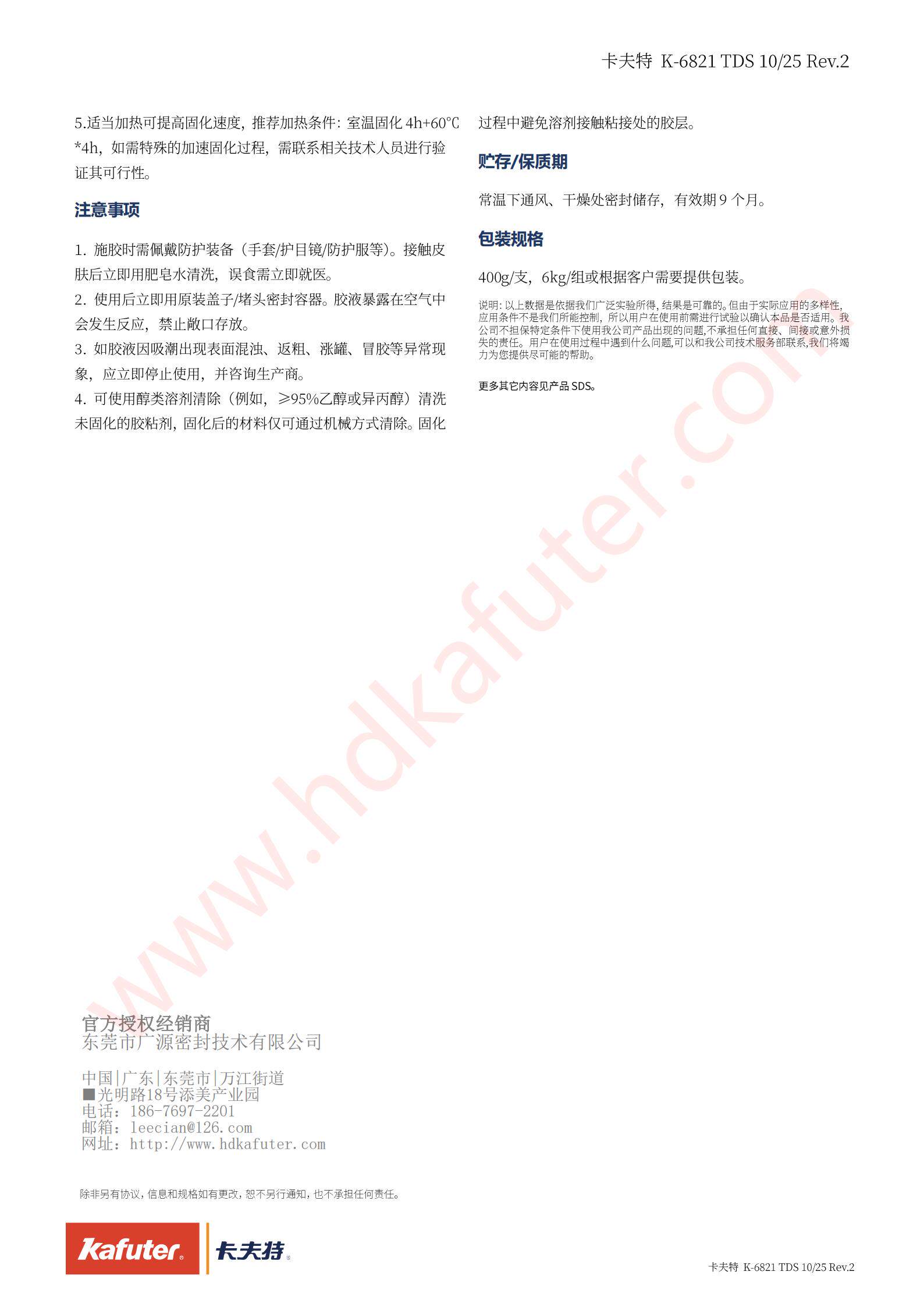 卡夫特K-6821是一个双组份MS杂化灌封胶,不含溶剂、游离异氰酸根,气味微小,流动性好,操作方便,混合容错性好。操作时间长,固化后韧性高、弹性好,具有优异的抗蠕变性,对常规材料,尤其是对工程塑料具有良好的粘结力。在高温高湿等条件下均能表现良好的抗老化性能。相对于单组分具有存储稳定、固化速度快、固化深度大的特点。