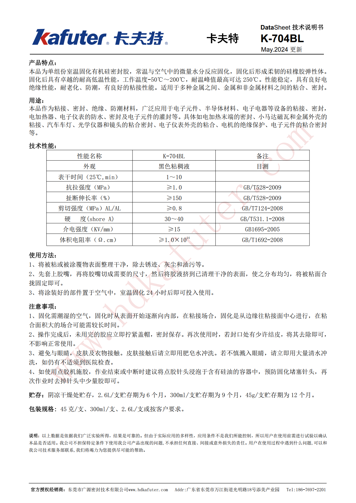 卡夫特K-704BL有机硅密封胶为单组份室温固化有机硅密封胶,靠吸收空气中的水汽缓慢固化,状态为黑色流淌,可以自流平,用于小型电子元件的薄层灌封绝缘保护。防水性能优异,包装规格有45g/300ml/2600ml多重施胶方式,卡夫特Kafuter官方授权经销商-东莞市广源密封技术有限公司www.hdkafuter.com,销售服务热线:18676972201,李先生