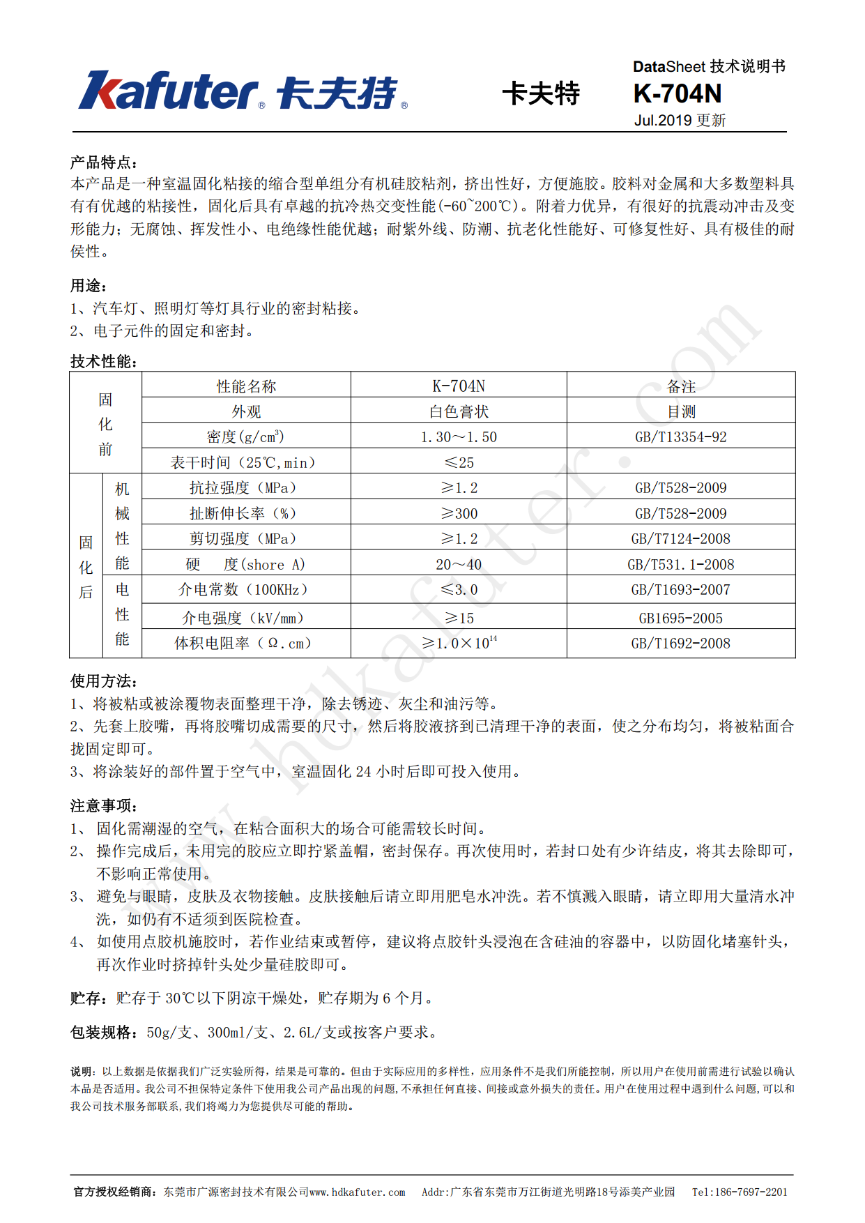 卡夫特K-704N有机硅密封胶是一种室温固化粘接的缩合型单组分有机硅胶粘剂,挤出性好,方便施胶。胶料对金属和大多数塑料具有优越的粘接性,固化后具有卓越的抗冷热交变性能(-60~200℃)。附着力优异,有很好的抗震动冲击及变形能力;无腐蚀、挥发性小、电绝缘性能优越;耐紫外线、防潮、抗老化性能好、可修复性好、具有极佳的耐侯性。卡夫特Kafuter官方授权经销商-东莞市广源密封技术有限公司www.hdkafuter.com,销售服务热线:186-7697-2201,李经理